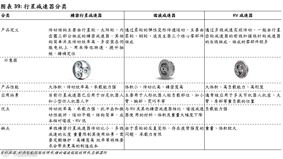 根据不同的构造和传动方式,减速器可分为行星减速器、谐波减速器和RV减速器。行星减速器结构简单且传动效率高,其常被用于机器人中对精度要求低的部分身体旋转关节。谐波减速器传动精度高,重量和体积小,运转平稳、传动比大,主要用于人形机器人轻负载部位,如小臂、腕部、灵巧手等。RV减速器由第一级渐开线行星传动和第二级摆线行星传动组合而成,刚性和耐过载冲击性能好,传动精度高,通常被应用于多关节机器人机座、大臂、肩部等重负载的位置。