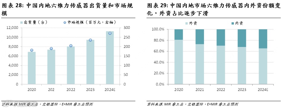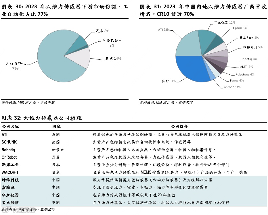 六维力传感器高端产品以国外企业为主,其技术优势体现在高性能材料、定制化应变计、精密加工工艺以及算法上。据MIR睿工业调查,2023年中国内地六维力传感器出货量9,450台,市场规模突破2.3亿元,平均价格为2.4万元/台。六维力传感器下游应用仍然以工业自动化为主,2023年占比为77%,人形机器人占比仍然较小,仅为2%。六维力传感器的市场集中度较高, 2023 年 ATI、宇立仪器分别占 22.4%、12.2%份额,TOP10 厂商共占据接近 70%的份额;外资品牌仍然占据主导,但份额已持续下降,从 2020 年的 80.9%下降至 2023 年的 67.9%。随着中国内地厂商的技术不断进步,技术差距缩小,以及中国内地品牌的性价比优势,中国内地品牌的市场份额有望取得进一步提升。