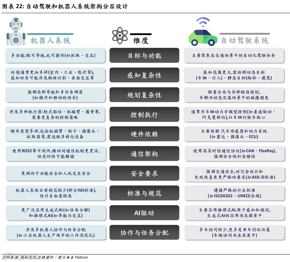 我们认为中国内地在自动驾驶/智能驾驶领域积累了丰富的系统集成经验,能够快速将这些技术迁移到人形机器人开发中,不仅加速研发进程,还能有效降低成本,为人形机器人的规模化应用奠定基础。智能驾驶系统需要将传感器、决策算法和控制模块高效整合,以实现车辆的安全导航,这种模块化、可扩展的架构设计同样适用于人形机器人。人形机器人也需要类似的框架来处理数据、制定决策并执行任务。两者在系统设计上的共通点在于对高效性和实时性的需求。