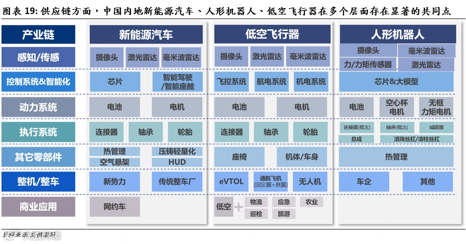 人形机器人关节电机、传感器、电池等核心部件与新能源汽车供应链重叠度达60%以上,具备规模化降本潜力。中国内地在新能源汽车领域已经建立了强大的供应链,包括电池生产、电机制造、传感器开发和控制系统设计等,这些优势可以通过技术转移、资源整合和政策支持,直接推动低空飞行器和人形机器人的发展。