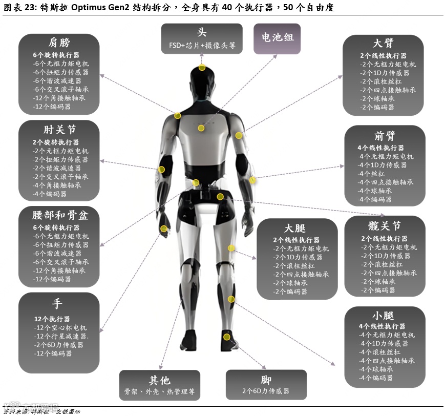 人形机器人的制造可分为三大部分:本体、“大脑”和“小脑”(运动控制)。“大脑”部分受益于人工智能,发展相对成熟;“小脑”部分的发展受到数据量限制,以及上肢运控底层算法尚未成熟等因素影响,尚在发展初期。人形机器人本体制造主要包括旋转执行器、线性执行器、灵巧手、感知系统、电池、皮肤等。以特斯拉Optimus Gen2为例,Optimus全身具有 40 个执行器,50 个自由度。
