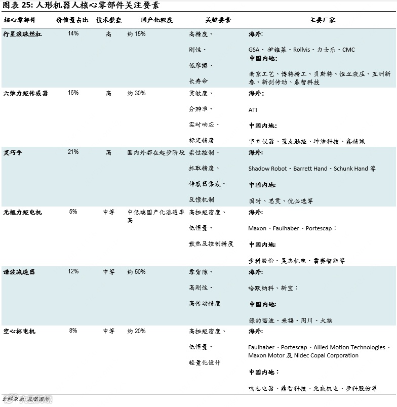 综合考量各零部件的价值量占比、技术难度以及国产化进度,我们认为,应该重点关注行星滚柱丝杠、六维力传感器、灵巧手、谐波减速器和空心杯电机。