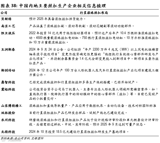 行星滚柱丝杠国产化率低,中国内地企业正在积极布局丝杠产能。行星滚柱丝杠市场在中国内地仍处于起步阶段,规模尚小,2023年中国内地行星滚柱市场外资占比85%,而中国内地企业占比仅为15%。行星滚柱丝杠市场集中度较高,CR5在80%以上,目前生产滚柱丝杠并参与市场竞争的厂家主要有: GSA(瑞士)、 伊维莱(瑞典)、Rollvis(瑞士)、力士乐(德国)、CMC(美国)、南京工艺(中国)、济宁博特(中国)、优仕特(中国台湾)。近年来,南京工艺、博特精工、五洲新春等企业开始布局行星滚柱丝杠,随着量产能力提升,预计国产占比有提升空间。
