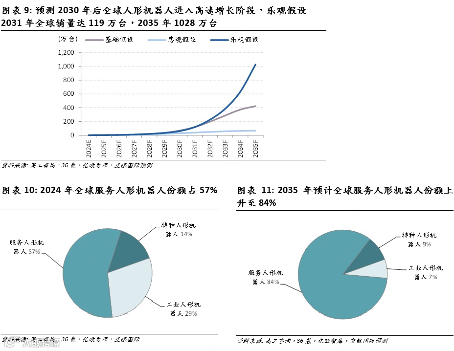 据高工产业研究院测算,2024年全球人形机器人市场规模约为10亿美元,对应年出货量1.19万台。我们预测至2030年,市场规模扩容至151亿美元,对应年度销量68万台。2031年之后,随着中国人形机器人产业链加快降本,和大模型的泛化能力飞跃提升,我们预计行业进入爆发式增长。这一增长曲线背后,既有工业场景从试点到规模复制的纵向深化,也涵盖新兴应用场景持续涌现带来的增量空间。基础假设下,我们预计到2035年,全球人形机器人出货量达400万台,2024-35年复合增长率70.6%。乐观情况下,我们假设2035年人形机器人的BOM成本下降更快,由2025年的6万美元下降到1.3万美元,以及大模型的泛化能力快速上升,赋予人形机器人处理复杂家庭任务的能力,人形机器人在制造业/服务业渗透率分别为0.4% / 0.5%,对应2035年人形机器人出货量1000万台, 2024-35年复合增长率84.9%。其中,我们认为全球服务人形机器人的占比将会由2024年的57%上升至2035年的84%。
