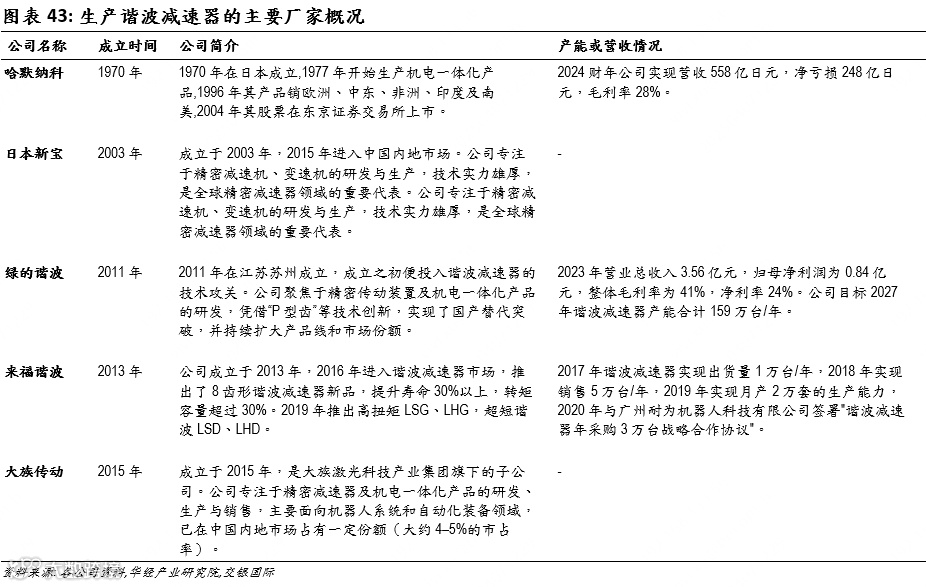 面对人形机器人对谐波减速器的需求,哈默纳科和绿的谐波纷纷扩产。2024 年10 月,哈默纳科计划进行约100 亿日元的战略投资,开拓新兴的人形机器人市场。2025 年1 月1 日,绿的谐波完成非公开发行募集资金14 亿元用于新一代谐波减速器扩产项目,拟建设100 万台/年谐波减速器产能,预计2027 年两代谐波减速器产能合计159 万台/年。