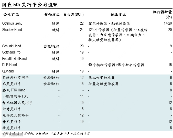 整体来看,欧美在高端精密领域具有优势,例如Shadow Robot开发的 Shadow Dexterous Hand 具有24个自由度、先进的缆绳驱动与多模态传感,能实现非常精细的操作。中国内地的灵巧手行业起步晚,多数采用标准伺服电机和成熟的减速技术,更注重性价比。随着机器人行业的发展,中国内地涌现了一大批灵巧手研发企业或研究机构参与者,主要包括因时科技灵巧手、思灵灵巧手、腾讯灵巧手等。
