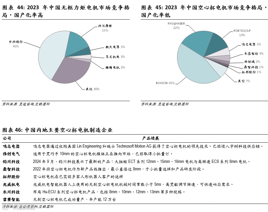 无框力矩电机目前还存在较高的技术壁垒,中国内地只有少量厂商能提供品质较高的无框力矩电机。其中步科股份依靠生产技术和较低的成本占据了较大的市场,是行业最大的无框力矩电机供应商。目前除了少量高端应用场景需要使用科尔摩根等国外厂商的无框力矩电机,大部分下游场景都已经开始使用国产产品,因此国产化程度高。无框力矩电机在人形机器人上用量更多,一般单台协作机器人使用6-7个,但单台人形机器人使用20个以上。