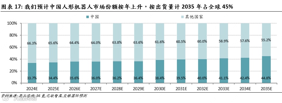 随着技术进步和社会需求增长中国人形机器人市场正迅速增长。凭借政府引导及扎实的产业链等优势,人形机器人产业正迈向大规模应用。此外,研发投入的增加、应用场景的不断拓展和资本市场的大力支持,也都在推动着人形机器人市场不断扩大。未来,中国人形机器人市场有望继续保持快速增长,我们预计2024-35年出货量的年复合增长率将超过75%,高于全球增长(基础假设下为70.6%),出货量将从0.4万台左右增至189万台。2024年中国人形机器人市场占全球份额为33.7%,受惠政策支持、技术进步、市场需求、供应链优势等多种因素推动下,我们预测市场份额将稳步上升至2035年的45%。