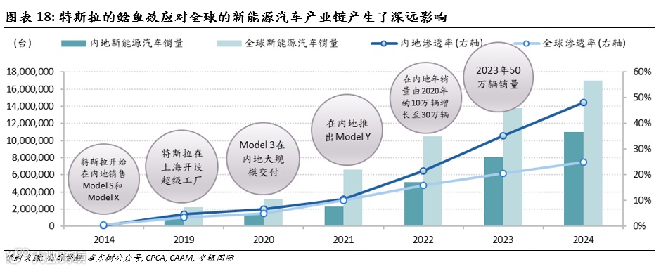 全球新能源汽车发展过程中,特斯拉作为引领者对全球和中国内地新能源汽车发展影响深远。其关键事件与销售、渗透率变化紧密相关,在中国内地,特斯拉的进入刺激了市场竞争并通过上海超级工厂本地化生产降低成本,推动新能源汽车市场快速增长。但随着中国内地新能源汽车供应链完善和产品发力,特斯拉市场份额从2021年的16.5%大幅下滑至2024年的8.1%。与此同时,比亚迪市场份额从2021年的9.5%增长至2024年4季度的28.2%,实现两倍多增长。