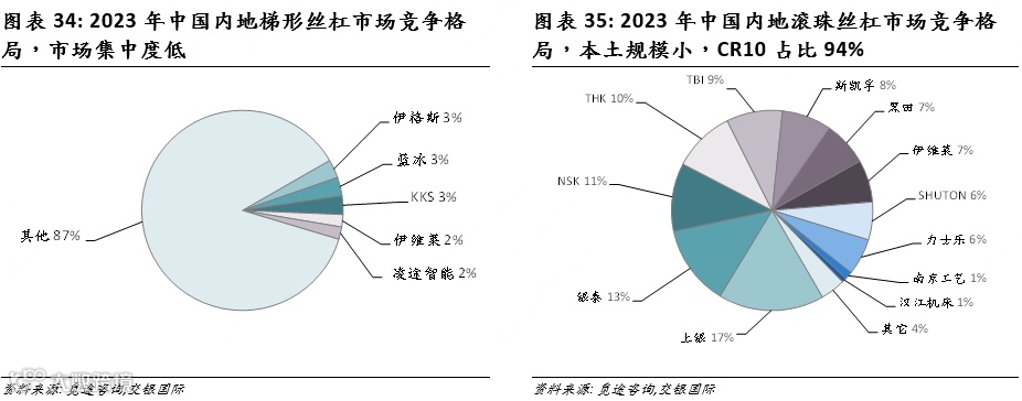 梯形丝杠技术门槛低,市场中参与者众多,头部企业没有显著的技术优势,小厂家反而能凭借较低的价格获取较多的订单,市场中有大量的中国内地厂家参与梯形丝杠的生产和销售,国外产品没有太多竞争优势,产品国产化较充分。中国滚珠丝杠市场主要被台资企业和外资企业垄断,中国内地企业目前规模较小,市场集中度方面,CR10占比94%。