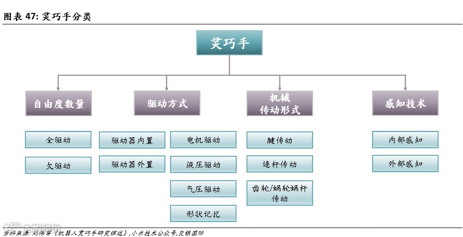 人形机器人灵巧手是一套高度集成的系统,其主要零部件和模块通常包括:电机、减速器、缆绳或腱带结构、传感器系统等。灵巧手种类繁多,可根据自由度数量、驱动方式、传动机构、感知技术等进行分类。