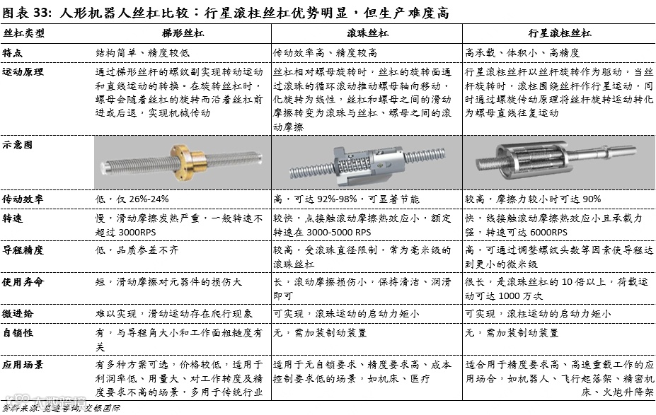 人形机器人中使用的丝杠包括梯形丝杠、滚珠丝杠和行星滚柱丝杠。梯形丝杠属于滑动丝杠,是最普通的丝杠机械,结构简单,制造方便,但其连续工作发热严重,传动效率较低。滚珠丝杠和行星滚柱丝杠属于滚动丝杠,滚珠丝杠载荷传递元件为滚珠,是点接触;行星滚柱丝杠载荷传递元件为螺纹滚柱,是线接触,具有高负载、耐冲击、体积小、高速等优点,但由于加工难度大,加工设备高度依赖进口。