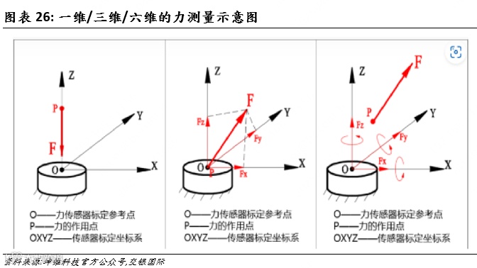 根据测力的维数,力/力矩传感器可以分为一维力传感器、三维力传感器、六维力传感器。六维力传感器是一种能够同时测量XYZ轴向力和环绕轴的力矩的传感器,通过内部算法解耦各个方向的力和力矩的干扰,使得力觉信息反馈更全面,是多维力传感器中功能最为全面、应用最为广泛的产品类型。六维力传感器的非线性力学特征明显,要考虑多通道信号的温漂、蠕变、交叉干扰、数据处理的实时性,再加之六维联合加载标定的复杂性,技术难度远比简单地组合三个一维力传感器和三个扭矩传感器复杂。