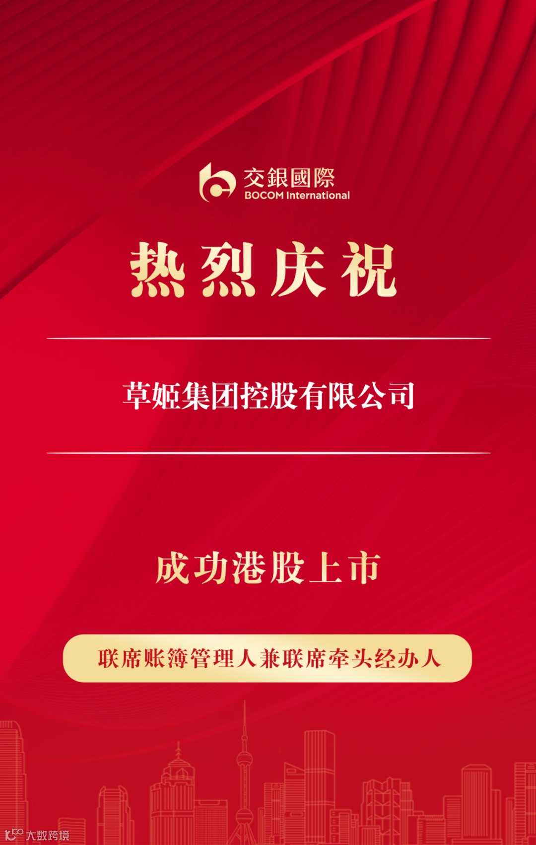 12月19日,草姬集团控股有限公司(“草姬集团”,2593.HK)在香港联交所主板挂牌上市。草姬集团本次全球发售定价每股3.75港元,发行33,333,600股,公开配售获6083倍超额认购,融资规模约为1.25亿港元。交银国际担任联席账簿管理人兼联席牵头经办人,助力草姬集团登陆港股市场。