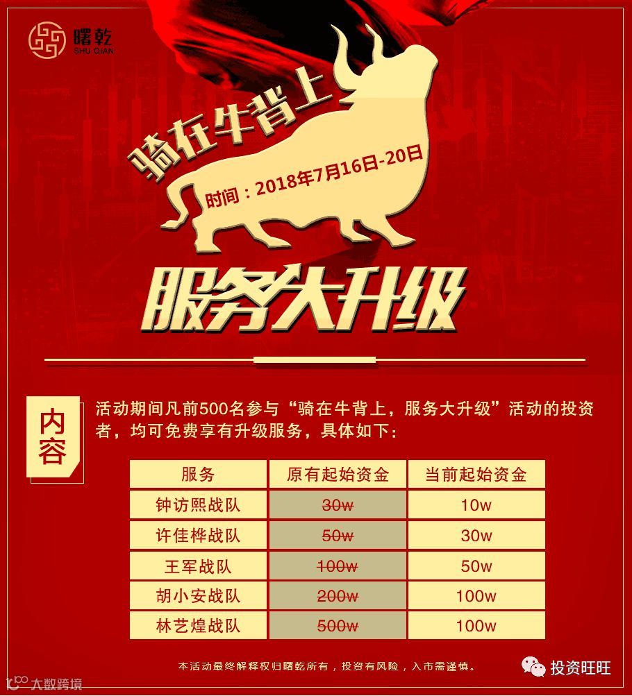 为了让更多的投资者朋友抓住此次机会,助力投资者把握此次“千金难买牛回头”的行情机会。曙乾特此举办“骑在牛背上,服务大升级”活动: