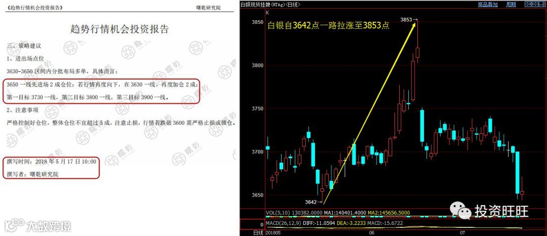 细看最近一次白银借势3650一线起涨行情,就在上个月中旬5月17日。当时曙乾从技术面和消息面专业判断白银即将启动一波趋势上涨行情,作为业内第一家也是唯一 一家提示并撰写内部研报的金融服务机构,曙乾的研发实力与专业度大家共同见证。不论是行情亦或是布局,之前的文章都一一分析过(往日文章链接)【中长线机会浮现】赢在6月,决胜2018!【重磅】趋势多头信号,行情扬帆起航!