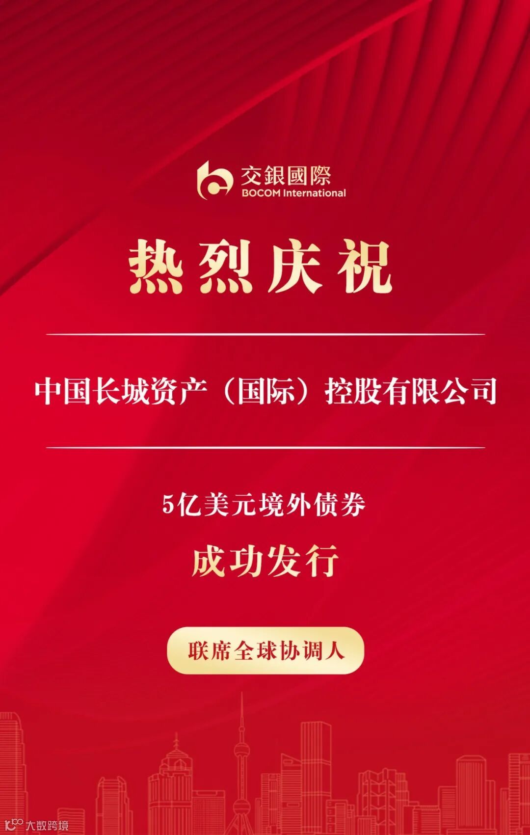 6月25日,交银国际作为联席全球协调人助力中国长城资产(国际)控股有限公司(“长城国际控股”)成功定价5亿美元境外债券,包含2亿美元3.5年期高级债券与3亿美元前3年不可赎回永续债券。