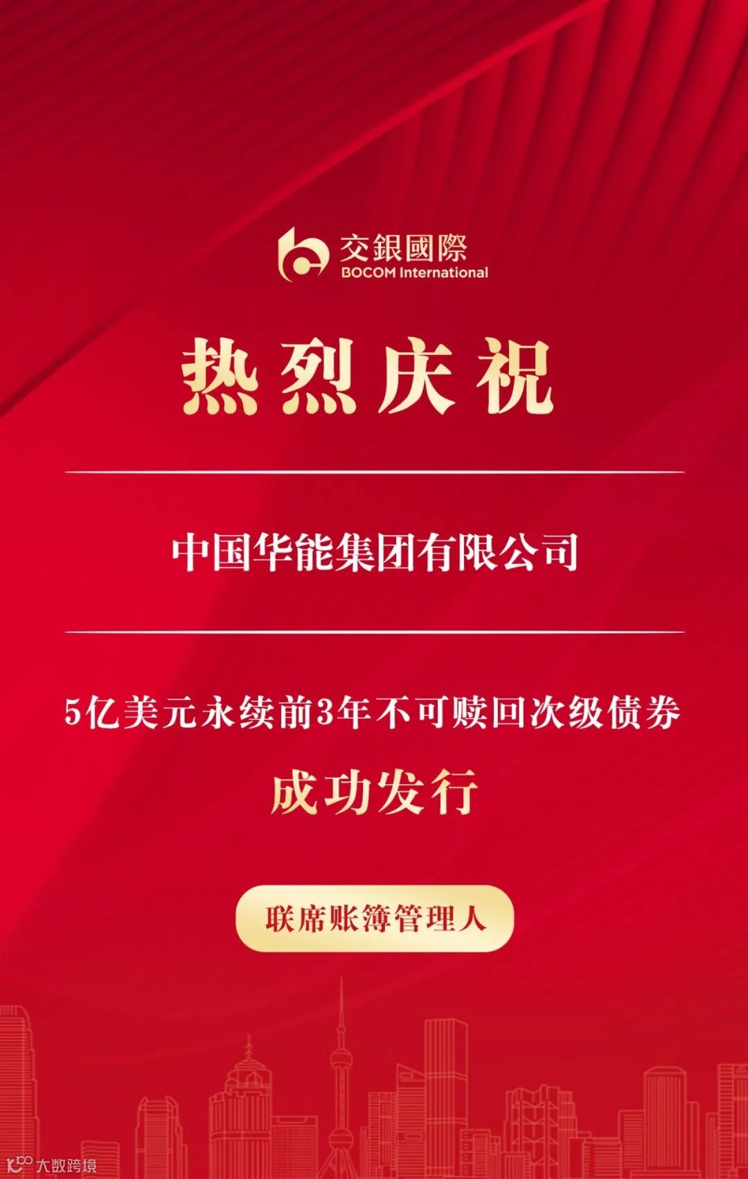 6月26日,交银国际作为联席账簿管理人助力中国华能集团有限公司(“中国华能”)成功发行5亿美元永续前3年不可赎回次级债券。中国华能以5.85%初始价格指导区间向市场打开簿记,峰值认购倍数超过8倍,最终发行收益率为5.3%,较初始价格指导大幅收窄55个基点。