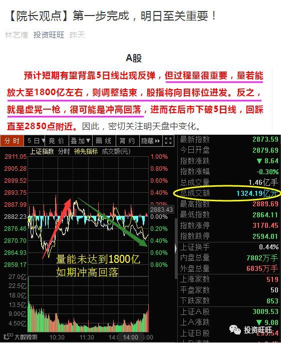 昨节目提示,预计短期有望背靠5日线出现反弹,但过程量很重要,量若能放大至1800亿左右,则调整结束,股指将向目标位进发。反之,就是虚晃一枪,很可能是冲高回落,进而在后市下破5日线,回踩直至2850点附近。今天仅仅只有1300亿,所以,股指上攻未果。