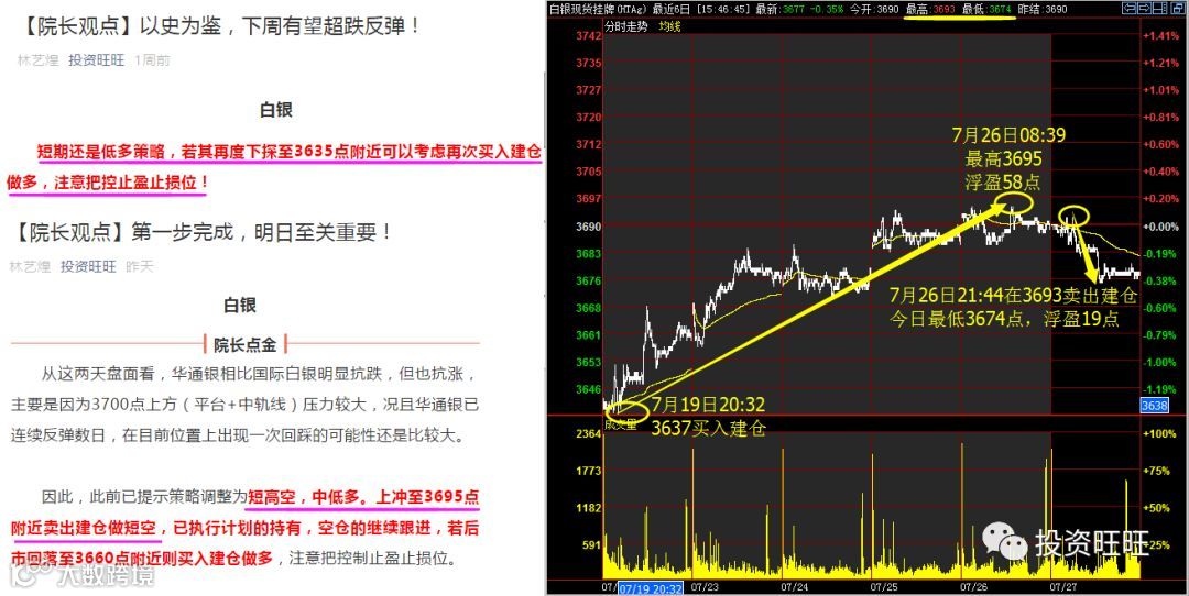 从最近盘面看,华通银相比国际白银明显抗跌,但也抗涨,主要是因为3700点上方(平台+中轨线)压力较大,况且华通银已连续反弹数日,在目前位置上出现一次回踩的可能性还是比较大。因此,此前连续三天提示上冲至3695点附近卖出建仓做短空,若昨日跟上操作,至今日08:30左右浮盈19点。