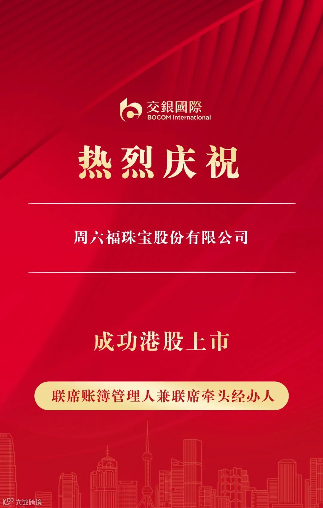 6月26日,周六福珠宝股份有限公司(“周六福”,6168.HK)在香港联交所主板挂牌上市。周六福本次全球发售定价每股24.00港元,发行53,829,200股,公开配售获711.11倍超额认购,融资规模约为12.92亿港元。交银国际担任联席账簿管理人兼联席牵头经办人,助力周六福集团登陆港股市场。