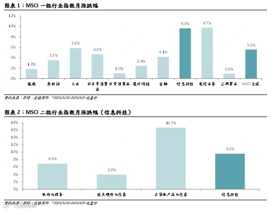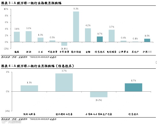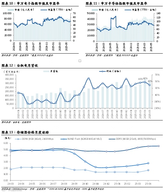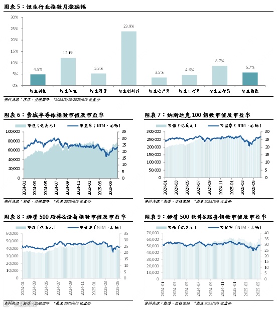 2025年5月10日至6月9日,MSCI信息技术指数涨9.6%,跑赢MSCI全球指数(涨5.5%)。Wind信息技术指数涨1.7%,跑赢沪深300(1.0%)。恒生科技指数涨4.9%,不及恒生指数(涨5.7%)。美股、A股和港股大盘继续维持反弹趋势,且延续美股科技股相比大盘更加强势,A股次之,而港股科技股跑输大盘的局面。我们认为部分原因来自贸易不确定性的进一步缓解,而港股科技股继续受估值回调的影响。估值方面,美股相关指数(图表6-9)的市盈率(NTM)最近一个月延续反弹,纳斯达克100指数涨2.1倍。申万电子指数市盈率略微增长0.3倍,而申万半导体指数市盈率下跌1.2倍。