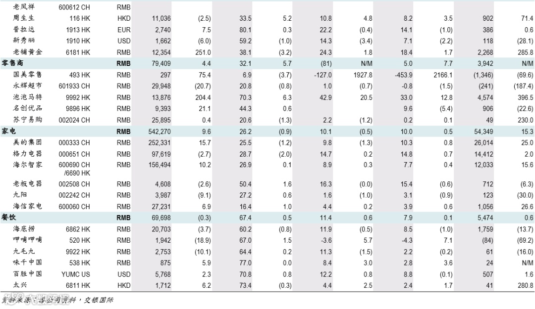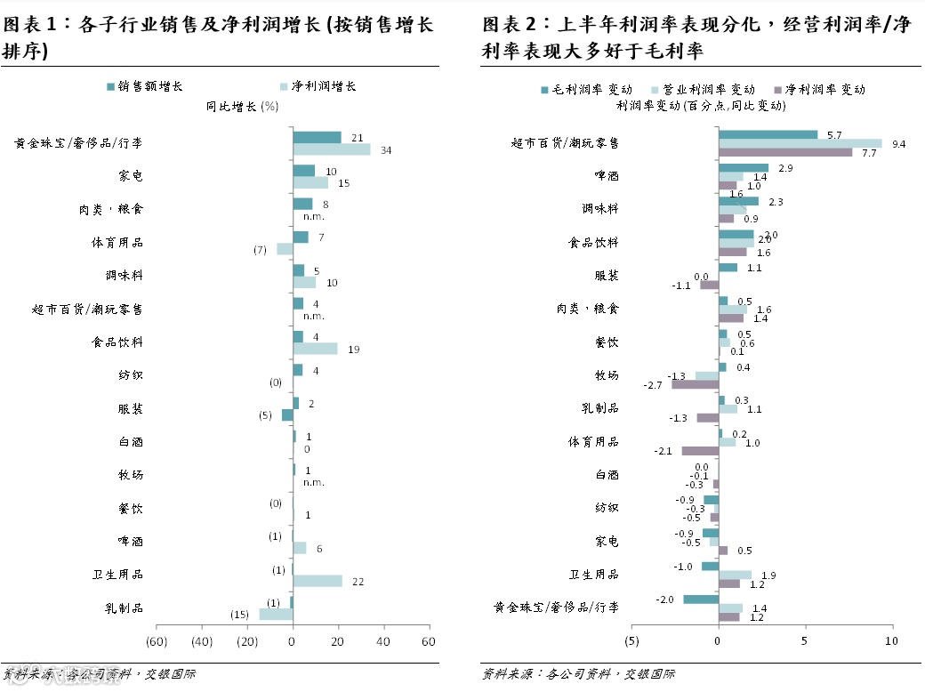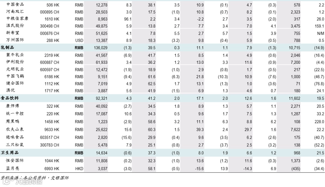 从收入端来看,黄金珠宝/奢侈品/行李销售额增长最强劲(同比增长 21%),与社零上半年的金银珠宝类别的表现类似,黄金珠宝品类在近年金价持续上涨的带动以及行业结构化升级的推动下录得亮眼增长;此外,增速居前的还有家电(同比增长 10%)和肉类/粮食(同比增长8%)。餐饮、啤酒、卫生用品、乳制品主要公司营收则小幅下降,受到消费者意愿和行业价格竞争的影响。