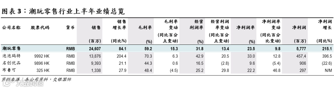 潮玩零售行业在上半年保持高增长态势,市场热度持续攀升:上半年我们看到IP经济爆发,驱动潮玩消费客群不断拓宽,产品逐步从兴趣消费品迈向更广泛的大众主流消费市场,行业天花板抬高。上半年,泡泡玛特依托持续丰富的IP矩阵和强劲的产品推新能力快速扩张,收入同比增长204%,领跑行业;名创优品旗下TOP TOY品牌同样表现亮眼,录得73%的高速增长;布鲁可上半年收入同比增28%,乐华娱乐的IP运营业务(包含潮玩业务经营)收入同比增128%。