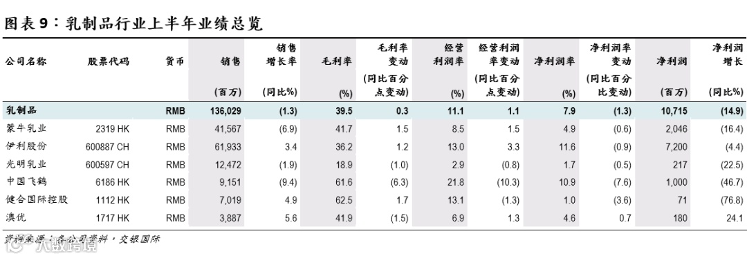 企业之间业绩呈现分化:伊利通过持续优化产品结构、提升运营效率,展现出更强的盈利弹性,上半年扣非净利率同比升 2.4 个百分点至11.3%,在去年同期高基数背景下销售费用率同比明显下降,扣非净利润同比大幅增长31.8%;蒙牛虽整体收入承压,但也通过成本控制和品类拓展稳住盈利能力,经营利润率同比扩 1.5 个百分点至 8.5%,提效降费效果明显。