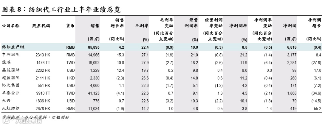 订单恢复驱动OEM(代工制造)企业收入增长,毛利率恢复需时:鞋服供应链上半年总销售额同比增长 4.2%,毛利率降 0.9 个百分点。上半年,上游制造商申洲国际订单复苏明显,收入同比增15.3%,但毛利率受到工人工资影响,同比降1.9个百分点,低于历史平均水平。展望2025下半年/2026年初,我们认为头部OEM企业的订单仍将持续增长,和主要客户的合作关系进一步巩固,但毛利率恢复需时。在全球供应链调整的背景下,OEM 制造商将继续优化产能布局,提升生产效率,以适应品牌商的库存管理策略和市场需求变化。申洲等头部OEM企业持续拓展海外产能,将有利于强化公司的规模优势,为未来的订单增长提供有力支撑。
