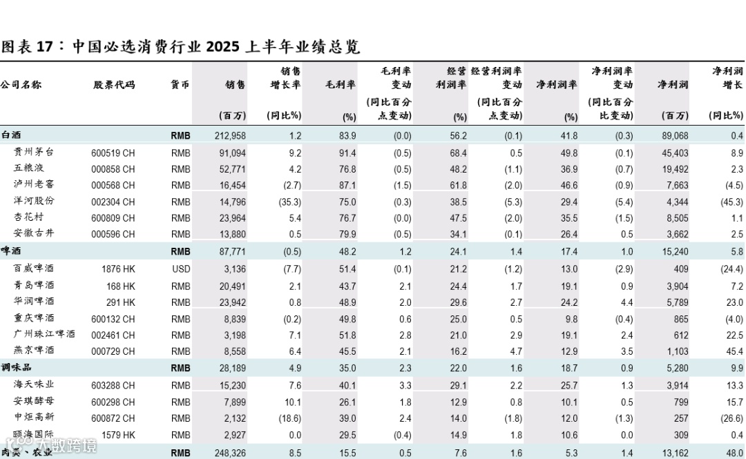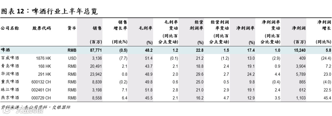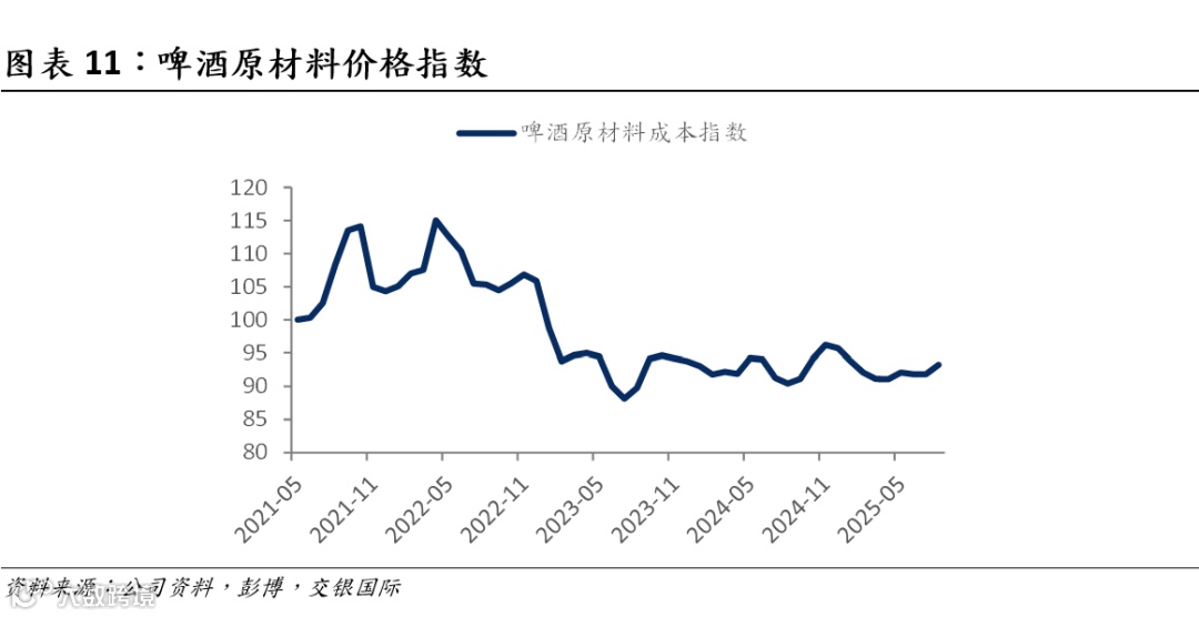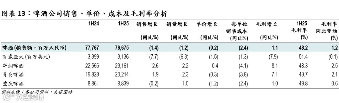成本红利释放,支持上半年毛利率表现:啤酒部分代表公司2025上半年总销售额同比下滑 0.5%,其中珠江 +7.1%、燕京 +6.4%、青岛啤酒 +2.1%、华润啤酒 +0.8%、重庆 -0.2%和百威亚太 -7.7%。在啤酒行业销量饱和、高端化趋势阶段性放缓的背景下,上半年啤酒企业销售均价大致持平去年同期。受益于原材料成本下行,行业盈利水平有所改善,六家主要啤酒企业的毛利率回升1.2 个百分点,成本红利成为短期业绩的支撑。