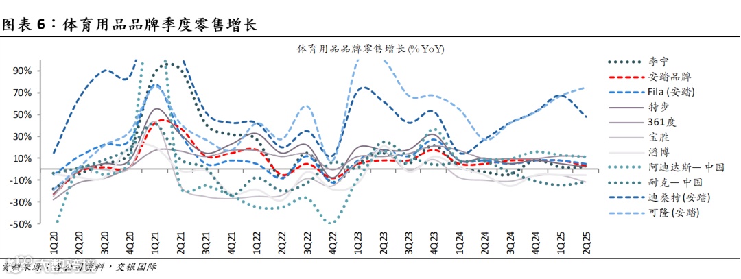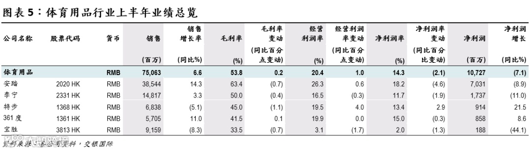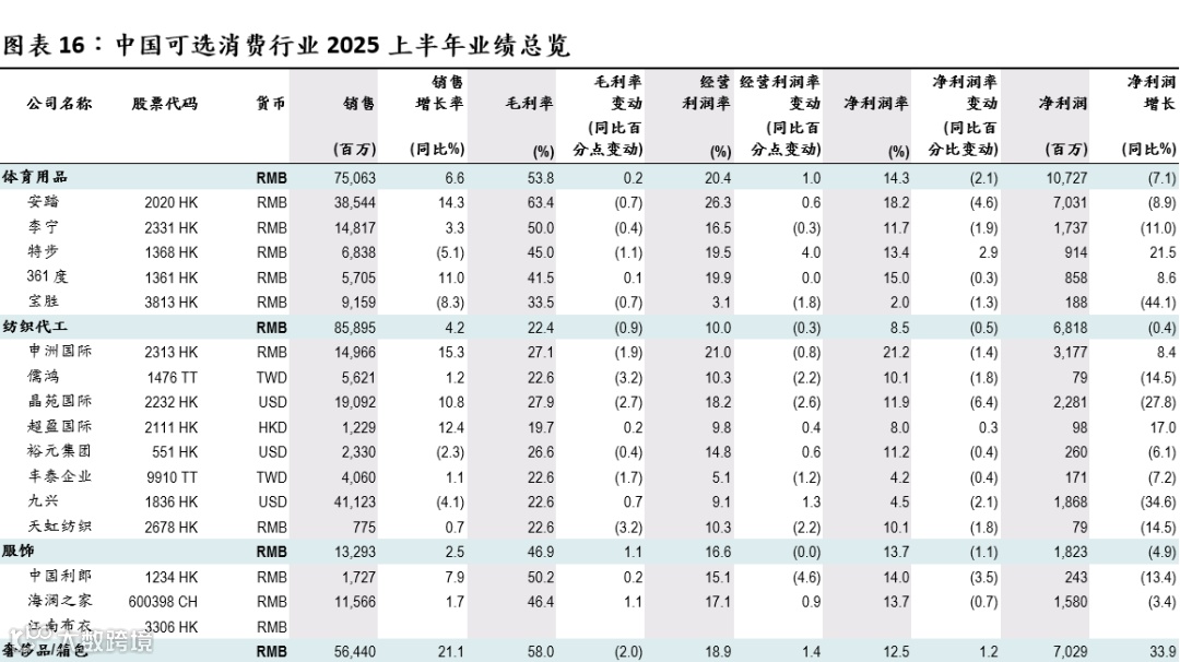 中国内地运动品市场竞争仍然激烈,专业运动品类需求坚挺:我们统计了5家体育用品公司2025上半年业绩,总销售额同比增6.6%(安踏增 14.3%,361度增 11.0%,李宁增 3.3%,特步/宝胜降5.1%/8.3%),但合计净利润同比降7.1%。上半年线下渠道客流仍然偏软,而线上渠道表现普遍好于线下。毛利率受折扣加深的影响,头部三大本土品牌的毛利率均录得同比小幅下降;但经营利润率的表现普遍好于毛利率,运营效率的提升部分抵消了毛利率影响。值得注意的是,专业运动品类展现韧性,李宁上半年鞋类表现(同比+4.9%)优于服装(同比-3.4%),跑步品类增长良好(流水同比+15%);安踏上半年其他品牌收入(主要包含户外品牌迪桑特和可隆)同比大幅增长 61.1%,户外运动等新兴品类高速增长持续。