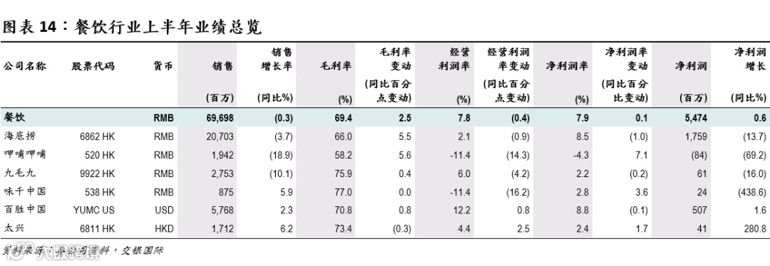 餐饮企业同店销售趋势仍承压,客单价趋于稳定:上半年,餐饮行业面临消费情绪偏弱和市场竞争加剧的挑战,我们关注的餐饮公司的上半年总收入同比下降0.3%,净利润略有恢复,同比增长0.6%,整体盈利能力仍然处于缓慢修复通道。从同店表现来看,多数餐饮品牌仍未恢复同期水平:九毛九旗下太二/怂/九毛九上半年同店分别同比下滑 19%/20%/20%,海底捞翻台率亦从去年同期的4.2次/天下降到3.8次/天,百胜中国表现更具韧性,其2季度同店销售已实现同比转正(+1%)。客单价恢复趋势逐步稳定,2季度太二(中国内地)/九毛九客单价环比上升1.5%/1.8%,怂火锅环比降2.0%;海底捞上半年自营餐厅客单价大致持平去年同期(2024/2025上半年:97.4/97.9元);肯德基客单价2季度在外卖带动下同比增长1%。