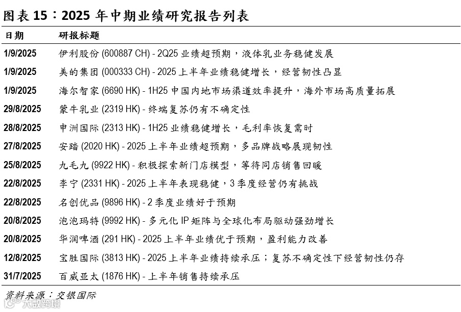 2025上半年中国内地消费市场整体呈现温和复苏态势,细分赛道结构性分化。我们观察到三大核心趋势:1)体验型消费领跑,情绪价值驱动的细分品类保持高增速,潮玩公司取得爆发式增长;2)全球化布局兑现收入增量,出海战略为多家消费公司贡献可观增长,在我们所覆盖的行业中,家电、零售公司在海外市场扩张带动下收入增长亮眼;3)运营效率成为盈利分化的关键因素,对于市场规模进入温和增长阶段的行业尤其明显。我们继续看好以下投资主线,1)善于捕捉消费者趋势、具备高增速潜力的细分市场玩家; 2)基本面稳健向好、通过运营效率提升持续巩固优势的行业龙头。