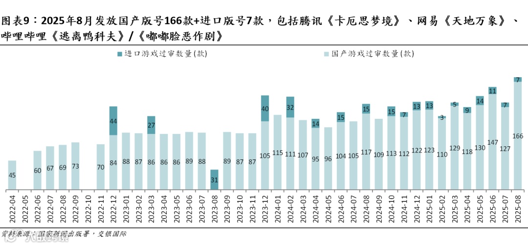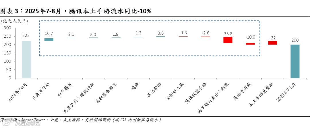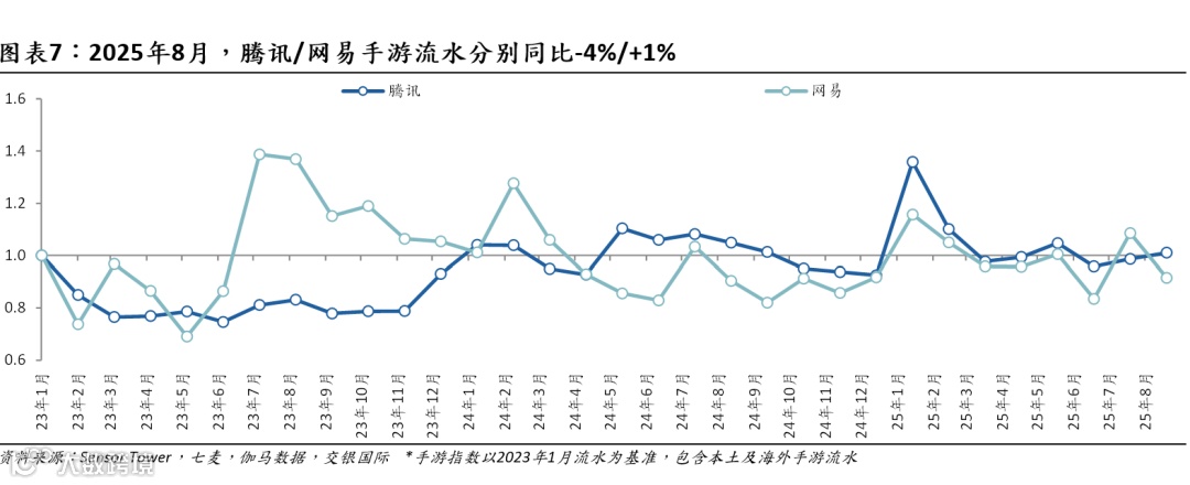 腾讯:重点新游上线,缓和本土手游流水高基数影响。本土流水同比净减22亿元/10%,主因《MDnF》高基数,部分被新游增量所抵消。《三角洲行动》8月流水环比有所回落,但仍高于7亿元。海外流水同比增4.7亿元/9%,主因《皇室战争》等游戏增量抵消《荒野乱斗》高基数影响。《皇室战争》8月流水超7亿元,同/环比增360%/20%,持续受益于头部KOL直播、匹配机制优化、玩法创新及热门IP联动,9月2日起连续4天登顶美国iOS游戏畅销榜。