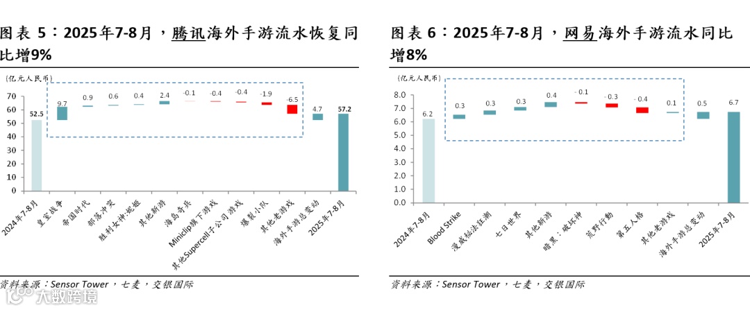 腾讯海外流水同比增4.7亿元/9%,主要因《皇室战争》等游戏增量抵消《荒野乱斗》高基数影响。《皇室战争》延续流水增长趋势,8月流水超7亿元,同/环比增360%/20%,持续受益于头部KOL直播、匹配机制优化、玩法创新及热门IP联动。9月2-5日,《皇室战争》连续4天登顶美国iOS游戏畅销榜,有望维持强劲流水表现。《荒野乱斗》维持单月3-4亿元流水量级,环比持稳。