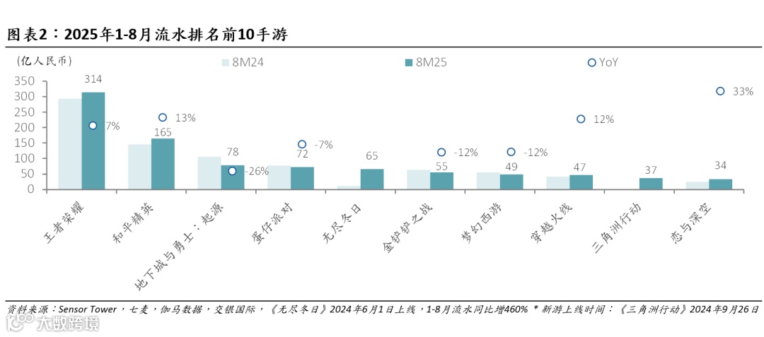 根据Sensor Tower、点点数据以及七麦数据:1)8月 TOP10游戏中,网易《蛋仔派对》/点点互动《无尽冬日》流水同比增速领先,分别+72%/59%。新游中,仅腾讯射击手游《三角洲行动》入榜。2)综合1-8月流水数据,点点互动《无尽冬日》同比增超460%,叠纸《恋与深空》同比增33%,领先其他手游,腾讯《王者荣耀》/《和平精英》持续展现增长韧性。