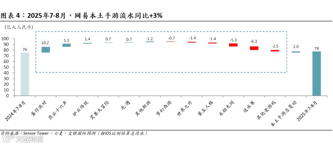 网易:同比增2亿元/3%,《燕云十六声》等新游及《蛋仔派对》增量贡献抵消《逆水寒》等高基数影响。《燕云十六声》表现稳定,维持2-3 亿元月流水量级。《蛋仔派对》受周年新版本“流浪蛋仔岛”及暑期运营拉动,8月单月流水维持超10亿元高位。
