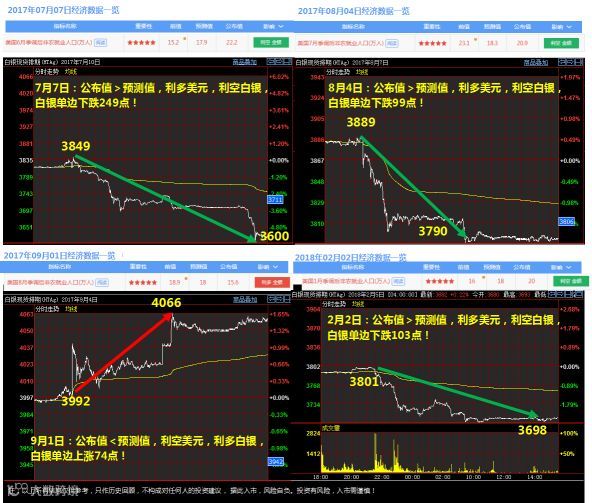 非农就业人数变化反映出制造行业和服务行业的发展及其增长,数字减少便代表企业减低生产,经济步入萧条利空美元,利多白银。若大幅增加,显示一个健康的经济状况,则利好美元。下图特意整理近10次非农数据对白银走势的影响,日均波动73点!