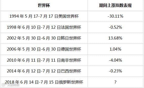 6月14日至7月15日俄罗斯世界杯,过去6次世界杯召开期间,沪指下跌有4次,“世界杯魔咒”因此得名。