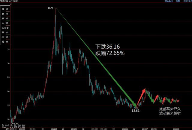 重要的是,从价格来看,目前白银的价格足够的低。国际白银价格自49.77美元/盎司高位回落至13.61美元/盎司,价格缩水72.65%,随后国际白银价格在底部蓄势2年之久,目前波动越来越窄。
