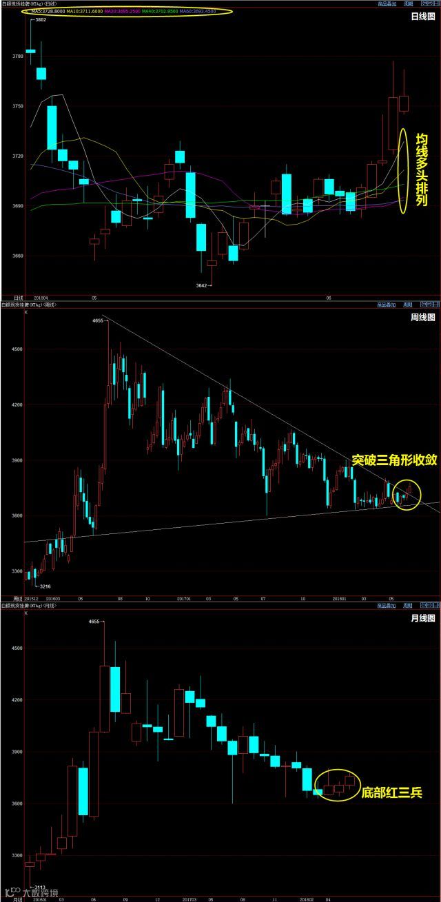 经过近期拉涨以后,白银在技术层面对于中长线多头有了更加有利的信号:日K线图均线正处多头排列、周K线图两连阳突破三角形收敛末端、月K线图底部出现红三兵形态,三线共振暗示白银后市大涨。