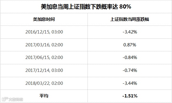 过去5次美联储加息当周,沪指下跌就有4次,平均跌幅1.51%。