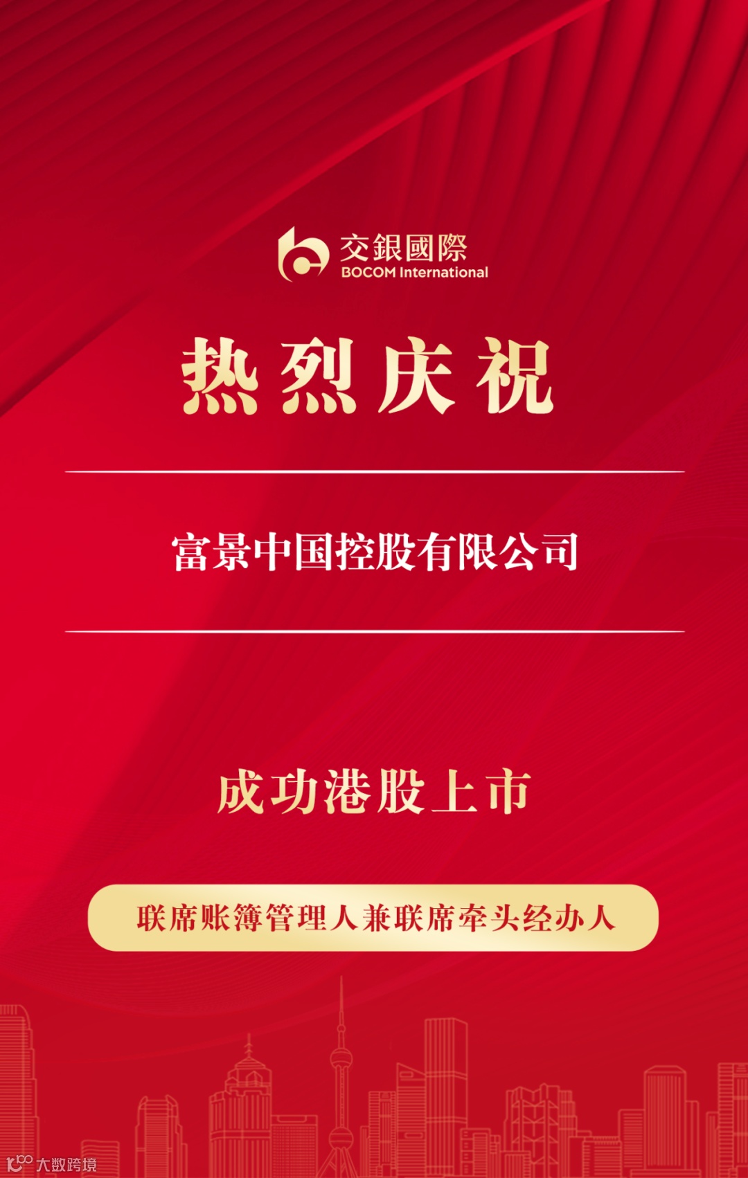 3月28日,富景中国控股有限公司(“富景中国”,2497.HK)在香港联交所主板挂牌上市。富景中国本次全球发售定价每股1.08港元,发行100,000,000股,融资规模约1.08亿港元。交银国际担任联席账簿管理人兼联席牵头经办人,助力富景中国登陆港股市场。