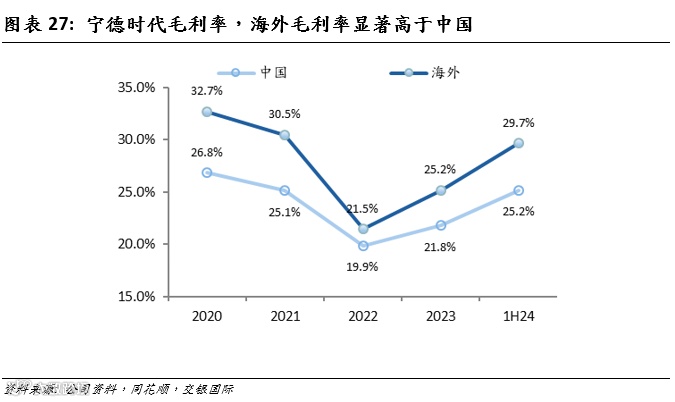 由于海外车企供应链进入门槛高,竞争格局集中,价格竞争并不激烈,电池定价方式为原材料联动和非联动部分年降,价格较为稳定;且日韩电池企业成本高,托底海外电池价格,海外电池的价格和毛利均高于中国,这吸引了很多中国电池企业选择将电池销往海外。以宁德时代为例,2020年-2024上半年,公司海外业务毛利率显著高于国内,2024上半年,在国内电池价格承压的情况下,海外业务和中国业务毛利率差值达到4.5个百分点,较2023年提升1.1个百分点。