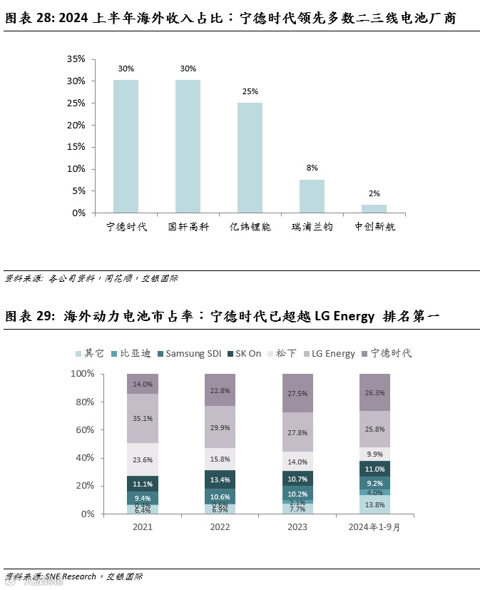 凭借着技术和成本优势,在海外动力电池市场,宁德时代市占率达到26.9%,已经超越韩国的LG Energy,排名第一。同时,宁德时代的海外收入占比稳步提升,2024上半年达到30%,高于多数二三线国内电池企业。