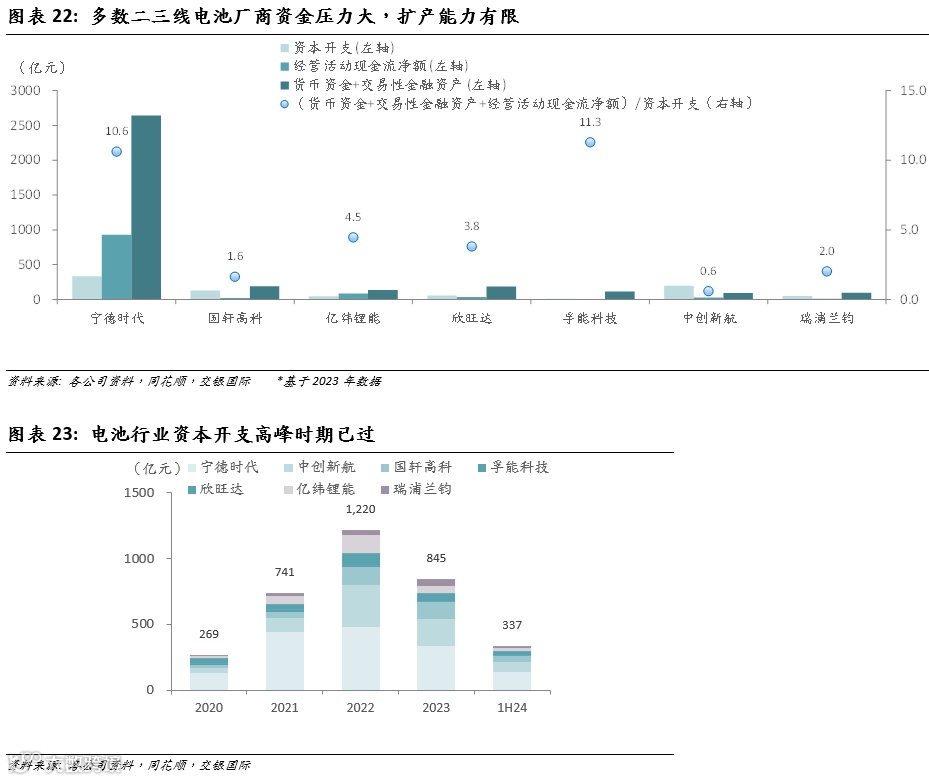 受制于盈利能力下滑和资金有限,我们预计锂电行业后续产能建设和投放进度将放缓。我们测算,多数电池企业货币资金、交易性金融资产和经营活动现金流净额之和很难维持大额的资本支出。2024上半年中国主要电池企业资本支出之和为337亿元,不足2023年的一半。宁德时代现金储备最为丰富,且多年来经营活动现金流大于净利润,是为数不多有能力不需要依靠融资就可以负担大额资本支出的电池企业。
