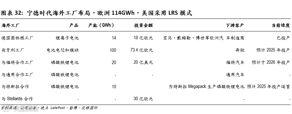 美国:宁德时代推出技术授权(LRS)模式,即许可、授权和服务模式。宁德时代负责建设电池产线、搭建供应链、调试产线设备和管理制造流程,工厂资本开支则全部由车企承担,宁德时代不在合作工厂占有股份,而是收取专利授权费和服务费。LRS 模式轻资产运行,帮助主机厂甚至电池厂快速建成电池工厂,目前已与福特/通用/特斯拉/Stellantis合作。