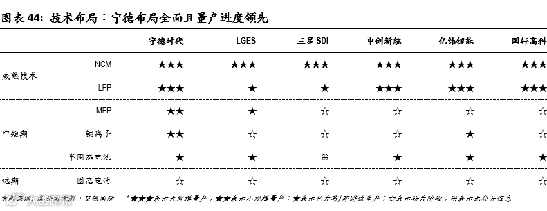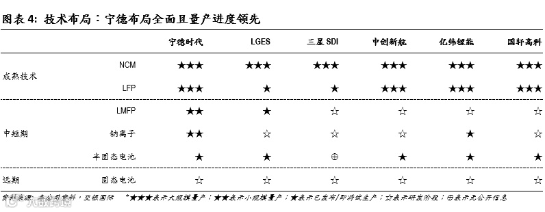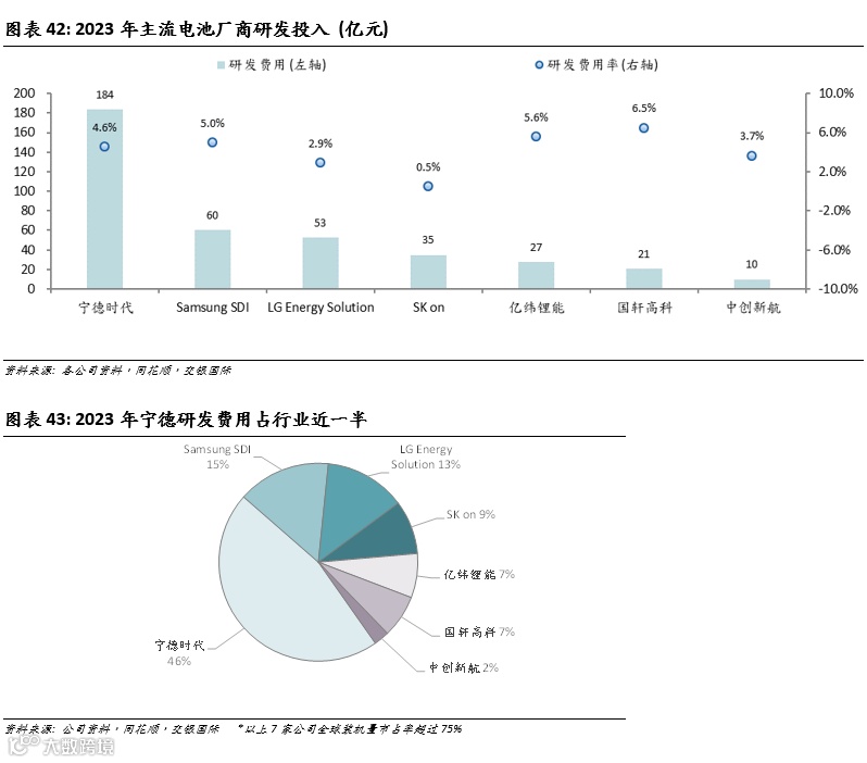 宁德时代重视技术创新,研发投入规模处于领先地位。2023 年公司研发费用为 183.6 亿元,远远高于二三线电池厂商,占据了主流电池企业研发总投入的45%以上。短中期技术发展看,快充电池、低温电池、无热扩散电池、锰基电池、钠离子电池等陆续上市,宁德时代引领行业新技术发展,陆续落地打造差异化竞争,与二线和海外厂商拉开差距。长期发展来看,固态电池为重点布局方向,宁德时代在半固态和全固态电池均有深厚的技术积累。