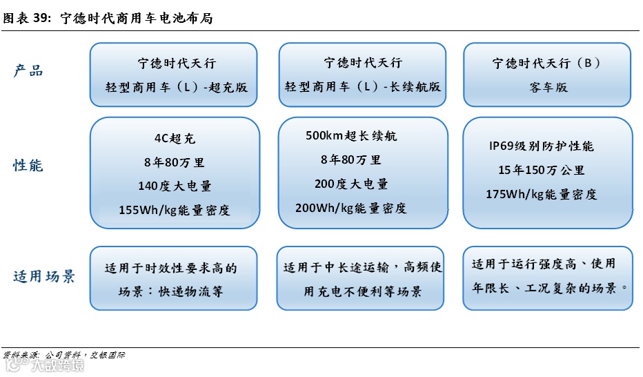 天行系列电池强化宁德时代在商用车领域的竞争力。2024 年 7 月,宁德时代发布天行电池,为物流车配送提供全场景的系列解决方案,发布全球首款 4C 的“天行 L-超充版”和 500km 续航“天行 L-长续航版”。2024年9月,宁德时代发布天行(B)客车版电池,将新能源客车全生命周期延长至15年150万公里,并将客车行业动力电池最高能量密度提升至175Wh/kg。
